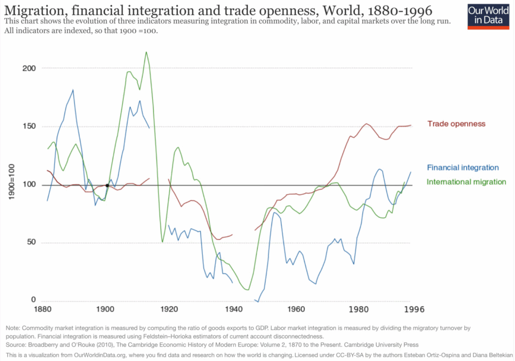 Após o fim da Guerra Fria, a década de 1990 marcou uma aceleração sem precedentes da globalização econômica. O volume do comércio internacional em proporção ao PIB global aumentou de forma contínua. Ao mesmo tempo, houve uma expansão significativa dos fluxos financeiros transfronteiriços e movimentos migratórios internacionais.
