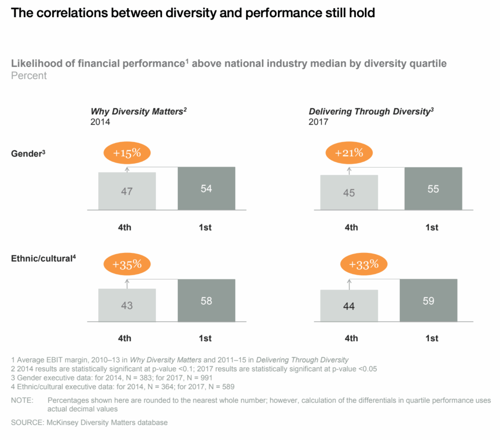 Apesar de possíveis dificuldades logísticas e culturais, dados da McKinsey indicam que a diversidade cultural possa melhorar a performance financeira de uma empresa.