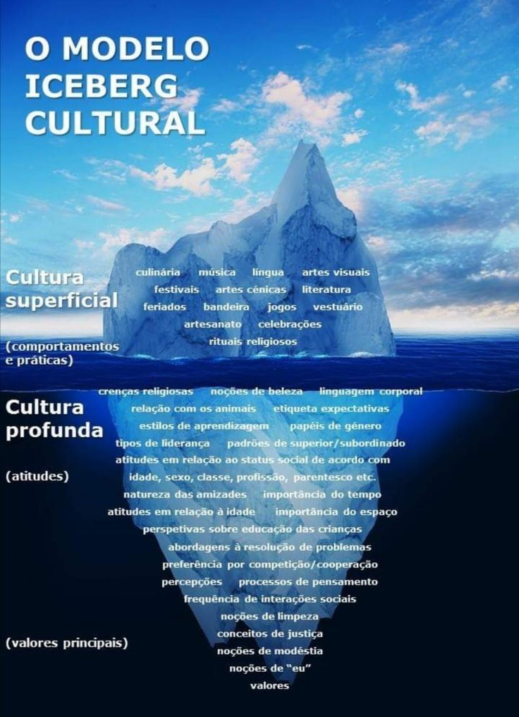 De acordo com o modelo “iceberg cultural”, é importante considerar aspectos que vão muito além da chamada “cultura superficial.” É provável, por exemplo, que um executivo saiba que na Espanha há certas comunidades autônomas que falam idiomas diferentes do espanhol. Da mesma forma, ele provavelmente reconhece elementos visíveis como culinária típica, estilos de vestuário ou festividades nacionais. Entretanto, é comum que líderes não conheçam suficientemente a “cultura profunda”, que orienta comportamentos e atitudes de equipes de outros países.